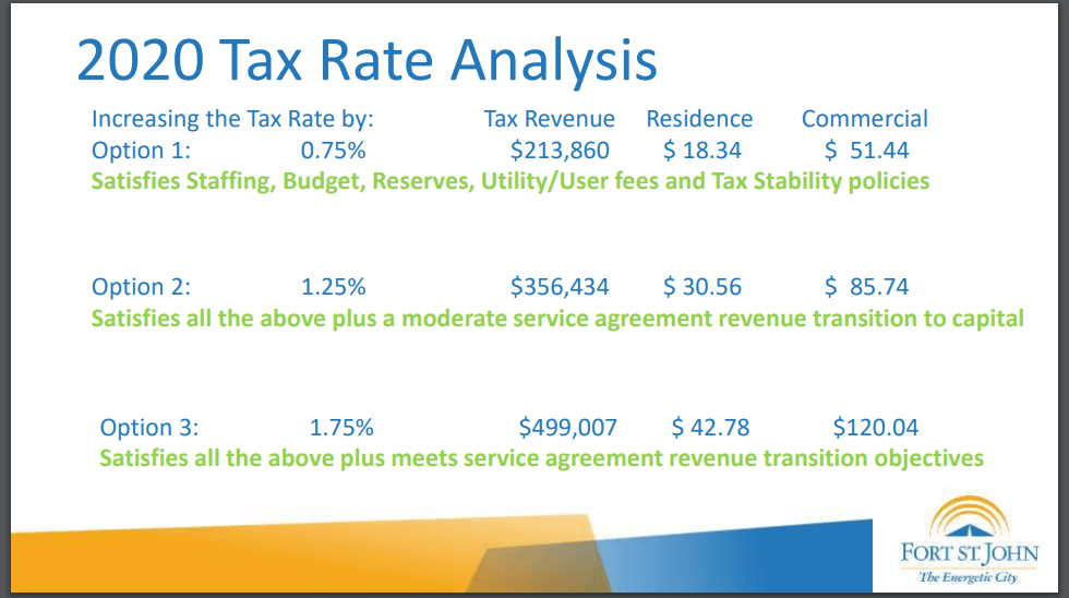 After a follow-up presentation at the Committee of the Whole meeting, Monday, January 27th, 2020, by David Joy, General Manager of Corporate Services for the City of Fort St. John, Council chose Option 2 to increase taxes by approximately 1.25 percent out of three presented options.