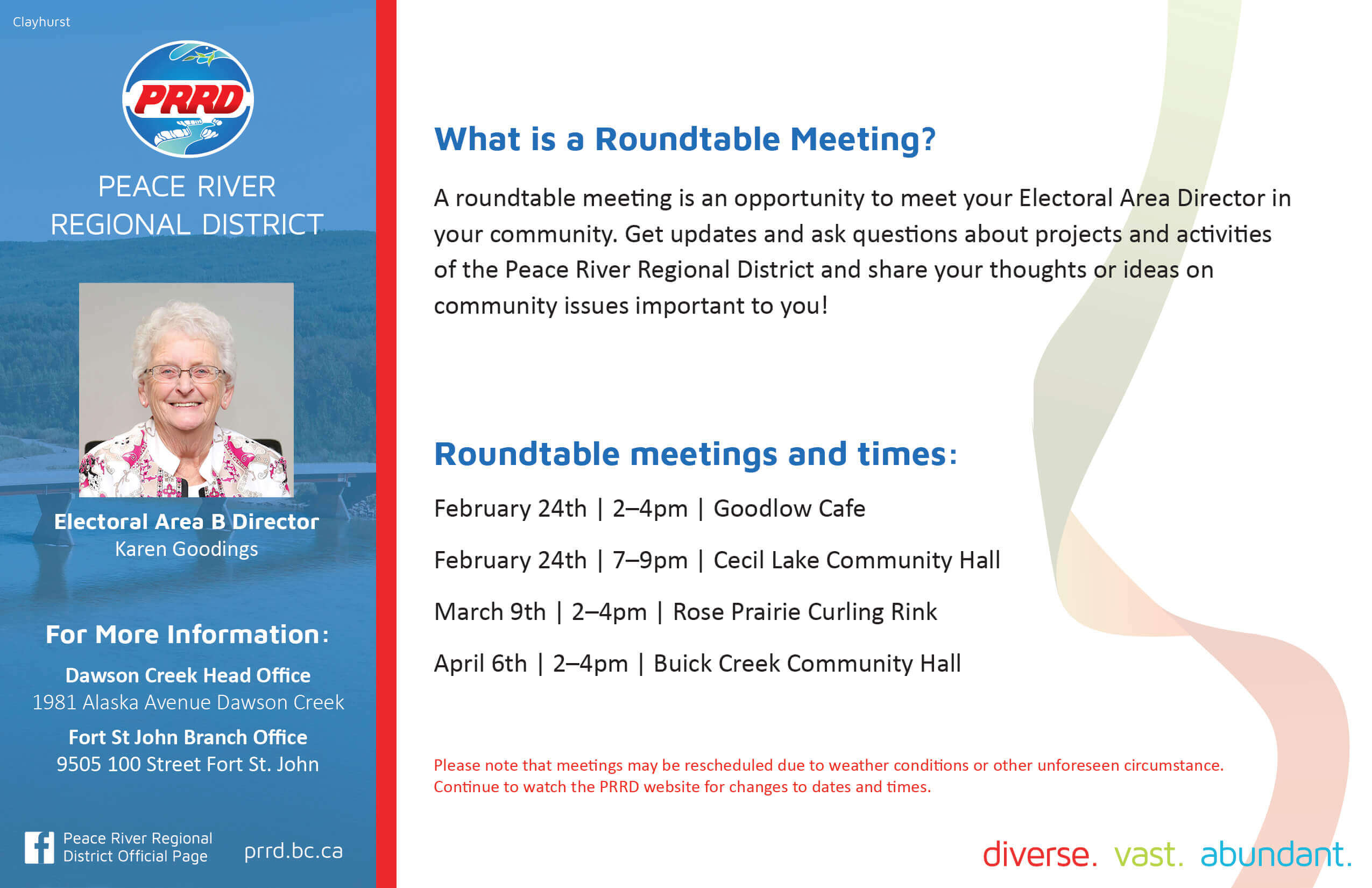 CECIL LAKE, B.C. – Peace River Regional District Electoral Area B Director, Karen Goodings is inviting residents in the Electoral Area B to talk and share ideas for their community at Roundtable Meetings this spring.