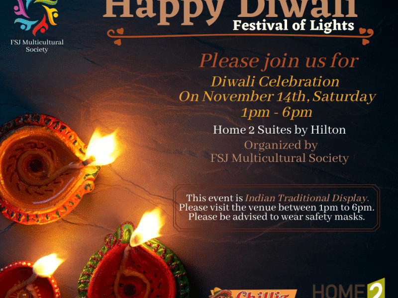 India’s flag will be raised below the Canadian Flag at the hotel at 6:00 p.m. and the Diwali Celebration live stream will immediately follow. The live stream can be watched on the FSJ Multicultural Society’s Facebook page.