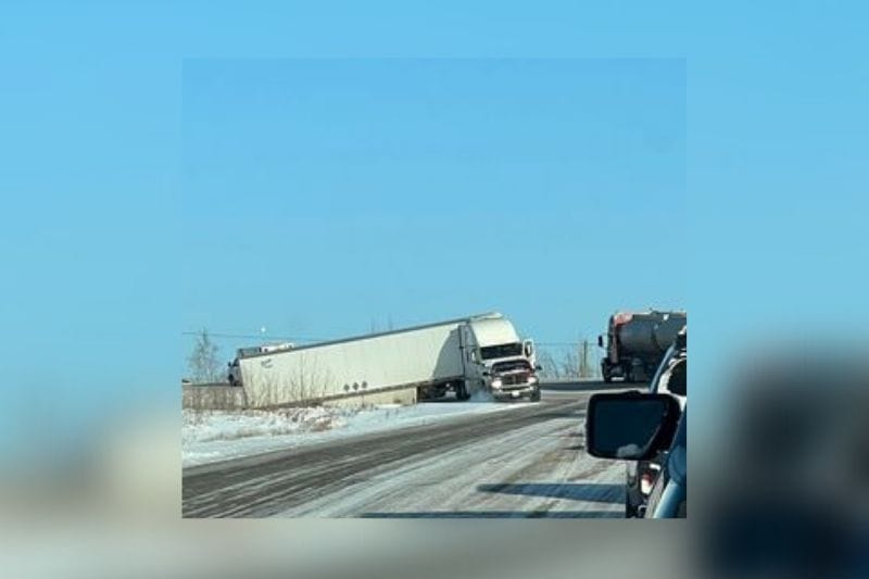 The southbound transport truck was going downhill in a sharp curve at low speed due to poor road and weather conditions at the time when it lost control and its trailer slid out into the path of the oncoming pickup truck.