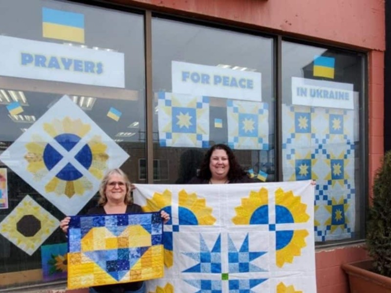 A display has been set up at Fireweed Market, where completed quilt blocks line the windows, a monument to the tragedies unfolding in Eastern Europe, and a prayer for peace and safety for those living in Ukraine.
