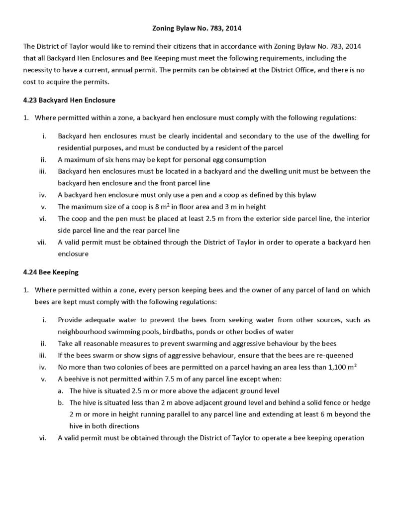 TAYLOR, B.C. – The District of Taylor would like to remind citizens of the Zoning Bylaw No. 783, 1014, regarding backyard hen enclosures and beekeeping.
