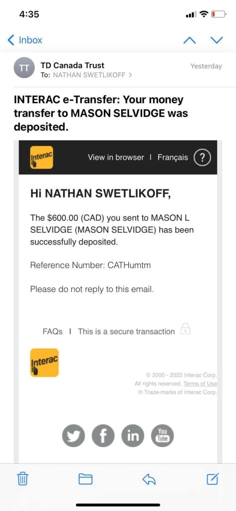 Proof that the money was sent to Mason Selvidge. (Nathan Swetlikoff)