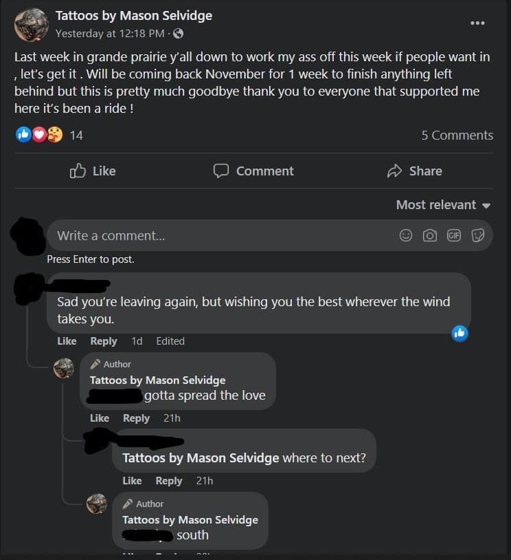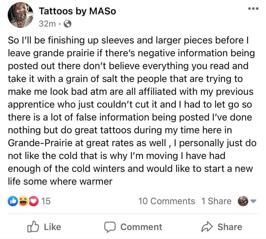 Locals warn community about Grande Prairie based tattoo artist