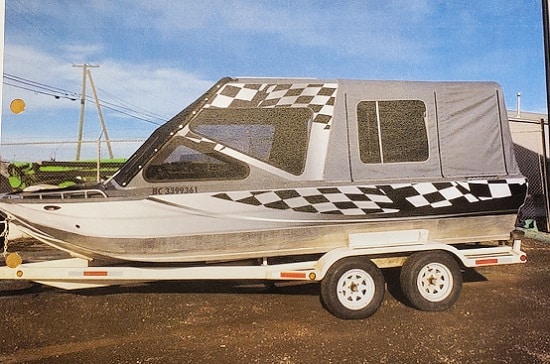The stolen boat is a 20-foot Shuman Vortex river boat enclosed with a 6.2 litre DI motor. The hull number is BC3399361, it had a checkered paint pattern, and it was loaded on a white 2004 U-built dual axle trailer with a BC licence plate UTT19N.