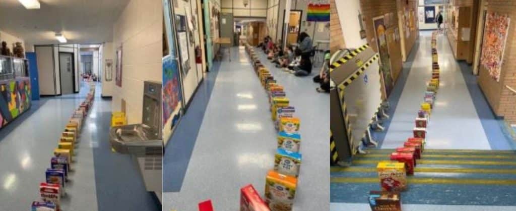 École Central Elementary School of the Arts students collected cereal boxes for the Salvation Army and Celebrated by placing them throughout the school in a domino-like way.