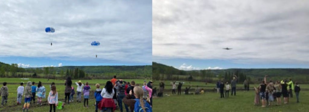 Students, staff, parents and neighbours witnessed 12 smokejumpers parachute to the ground and complete a cargo drop.