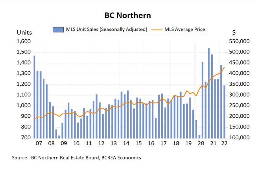 “Although sales in the north have been falling in recent months, total sales in the first half of 2022 are still about 23 per cent above the pre-pandemic long-run average. While supply is rising, the sales-to-active-listings ratio is only beginning to approach a more balanced level in the latest monthly data,” the BC Northern Real Estate Board said in a release.