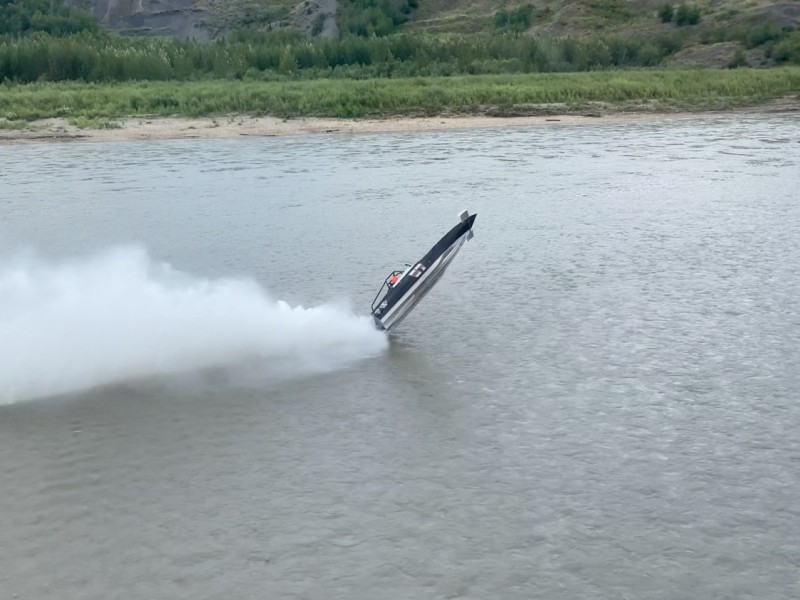 PEACE RIVER, ALTA. – Local boat racer Clint Mohr, with boat #57 “Mohr Aggressive,” had a close call at the Peace River Gold Cup jet boat race last weekend, but managed to place third overall regardless.