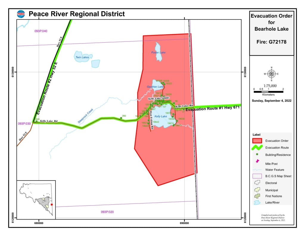 The Peace River Regional District says any residents that remain in the evacuation zone should leave the area immediately. Residents are now being instructed to leave the area via Highway 671 to Range Road 131 and then North to Highway 43 as the preferred exit route because it is expected that there will be significant smoke limiting visibility along Highway 52 East.