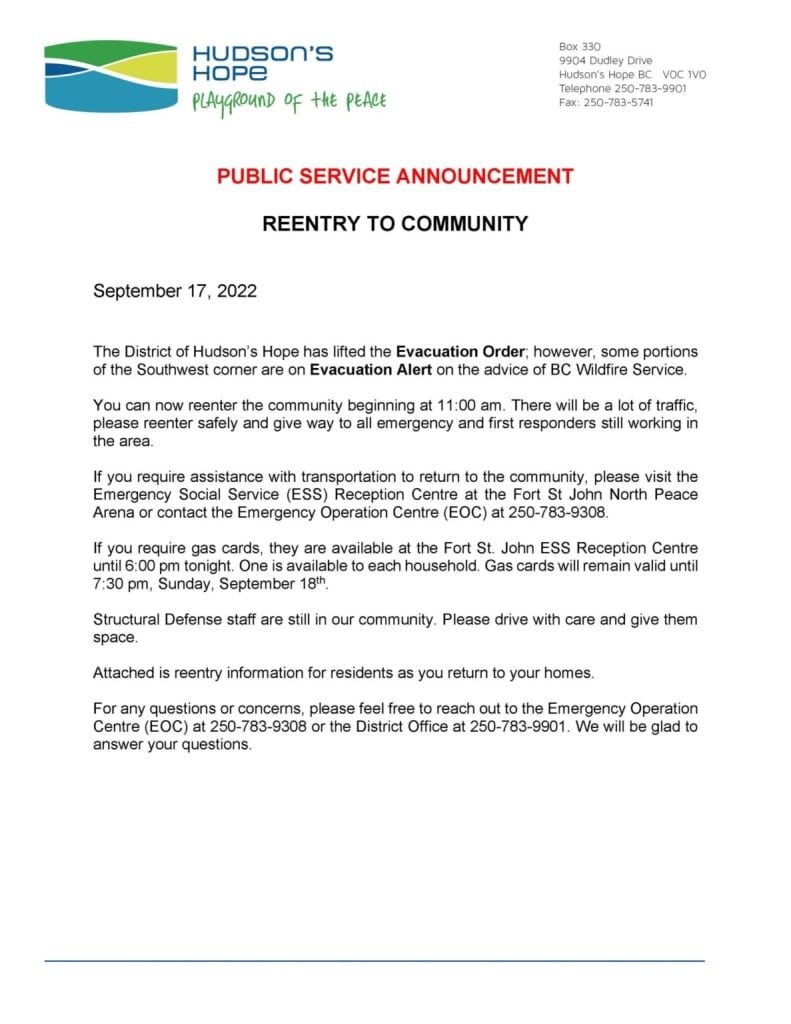 Residents that need help returning to the community should contact Emergency Support Services in Fort St John before leaving.