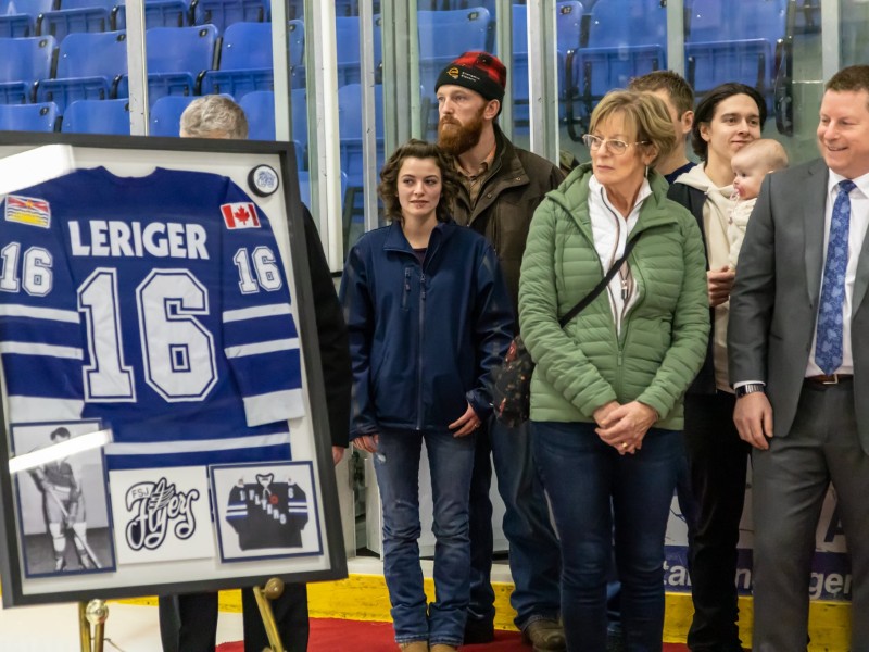 The Flyers honoured Leriger with a speech from the team’s president, Paul van Nostrand, before retiring his jersey number 16.