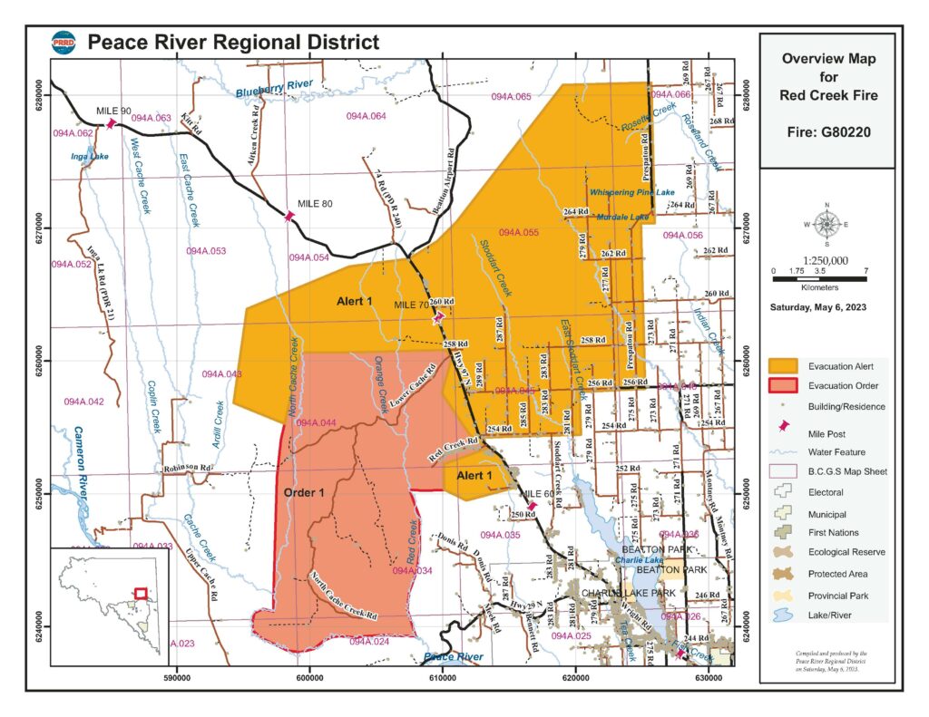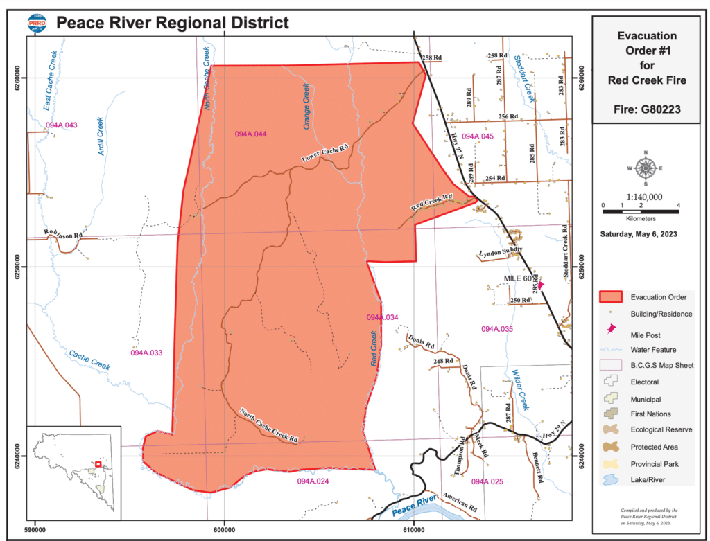 Residents are advised to evacuate the area immediately by travelling on the Red Creek Road or Lower Cache Road East to Highway 97N and continue to the Emergency Support Services reception centre located at North Peace Arena at 9805 96 Avenue in Fort St. John, BC.