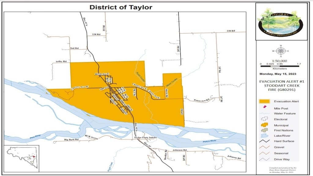 The District of Taylor has placed all properties within the district on Evacuation Alert due to the Stoddart Creek wildfire.