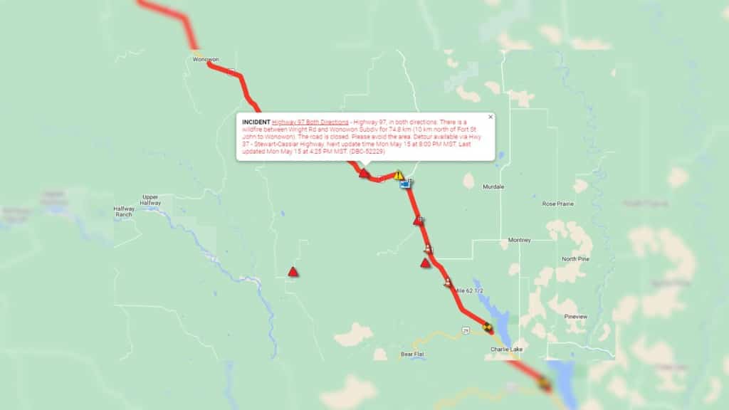 FORT ST. JOHN, B.C. — Highway 97 is closed from Highway 29 (Mile 54) north to the Mile 80 rest stop, according to the Ministry of Transportation.