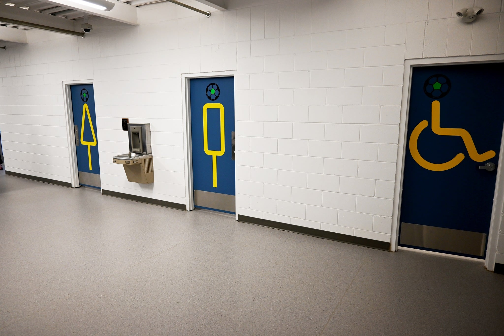 Three blue bathroom doors on a white brick wall.