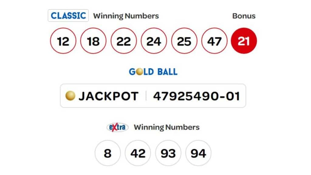 The winning numbers are 12, 18, 22, 24, 25, and 47, and the bonus is 21.