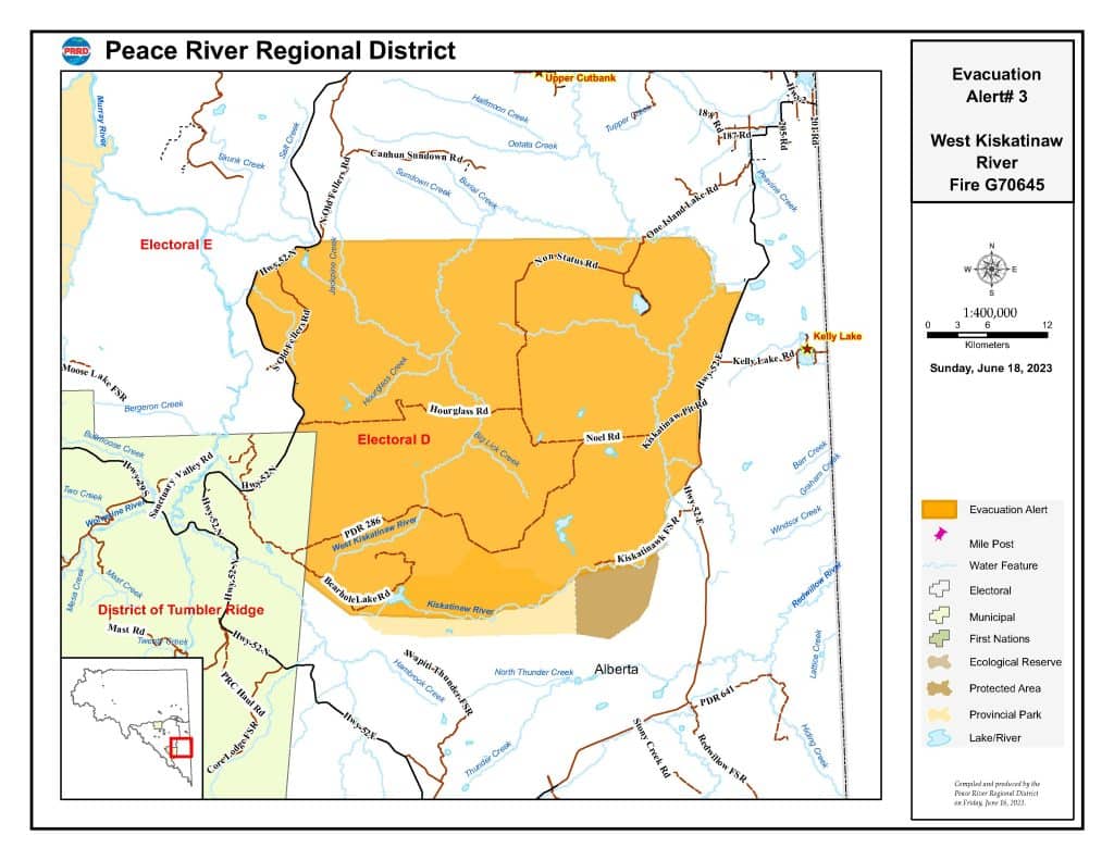 Based on recommendations from B.C. Wildfire Service, the Peace River Regional District, has rescinded West Kiskatinaw River Evacuation Order #4 as of June 18, 2023, at 0900 hours (9:00 a.m.).