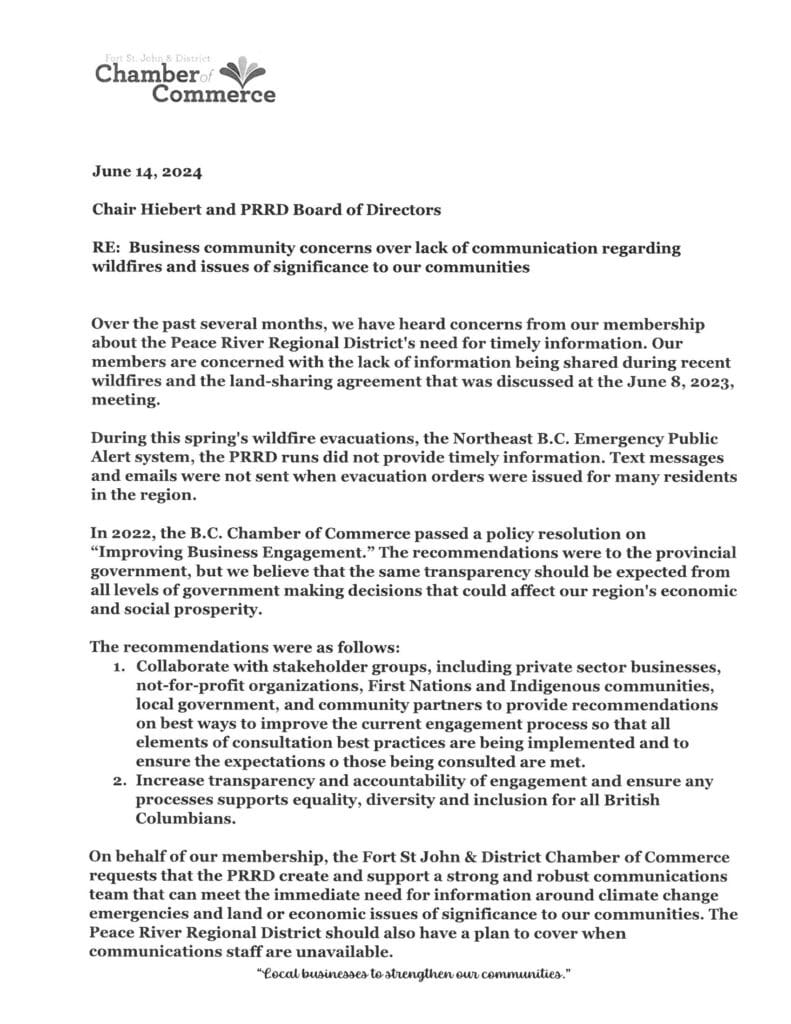 The Fort St. John & District Chamber of Commerce recently penned a letter addressing its concerns brought up by its membership on the Peace River Regional District’s (PRRD) lack of communication over the past couple of months.