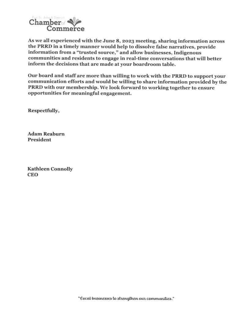 “As we all experienced at the June 8th, 2023 meeting, sharing information across the PRRD in a timely manner would help dissolve false narratives, provide information from a ‘trusted source’ and allow businesses, Indigenous communities and residents to engage in real-time conversations that will better inform the decisions that are made at your boardroom table,” the letter from the chamber continued.