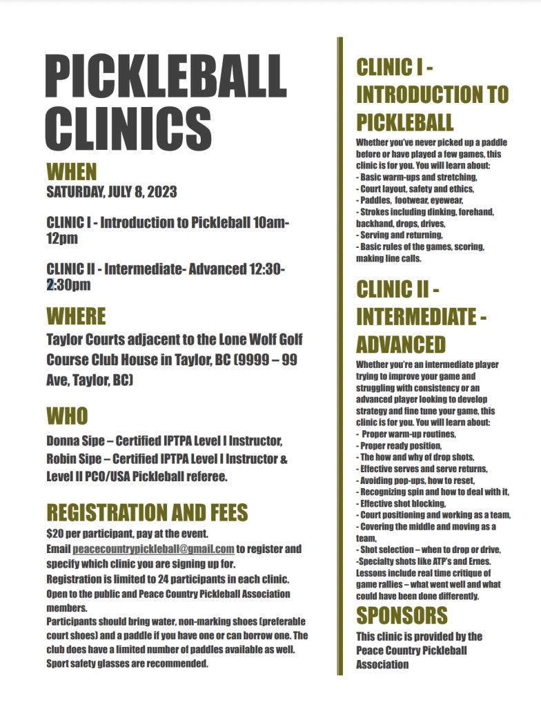 The Peace Country Pickleball Association is providing two clinics on July 8th at the pickleball courts in Taylor.