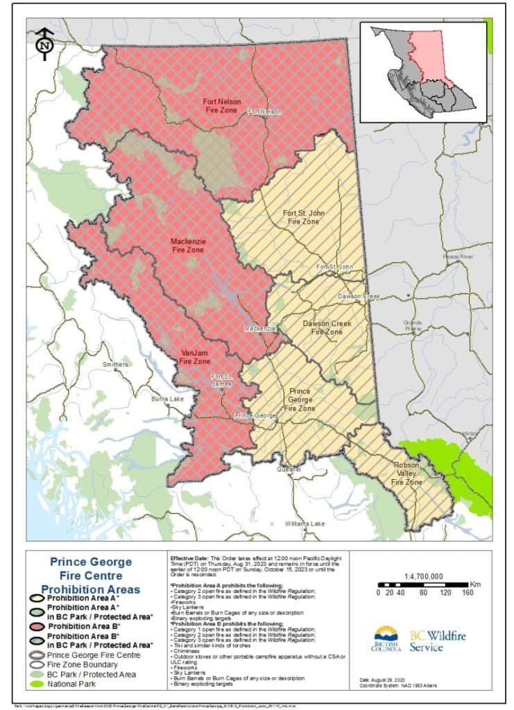 As of noon on Thursday, category one fires will be prohibited across the Prince George Fire Centre’s Vanderhoof, Fort St. James, Mackenzie and Fort Nelson fire zones.