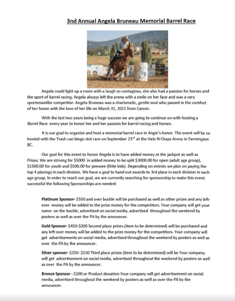 FORT ST. JOHN, B.C. — The 3rd Annual Angela Bruneau Memorial Barrel Race is scheduled to make its return to the Hats N Chaps Arena in Farmington later this month.