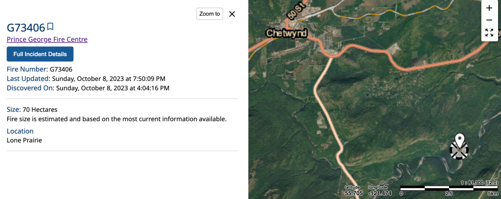 The Peace River Regional District issued an evacuation alert for an area near the fire. The alert includes properties near Highway 97 (West of Chetwynd Pulp Mill Rd and East of Guillet Sub) and certain properties on Rimsmith Rd. For details click here.