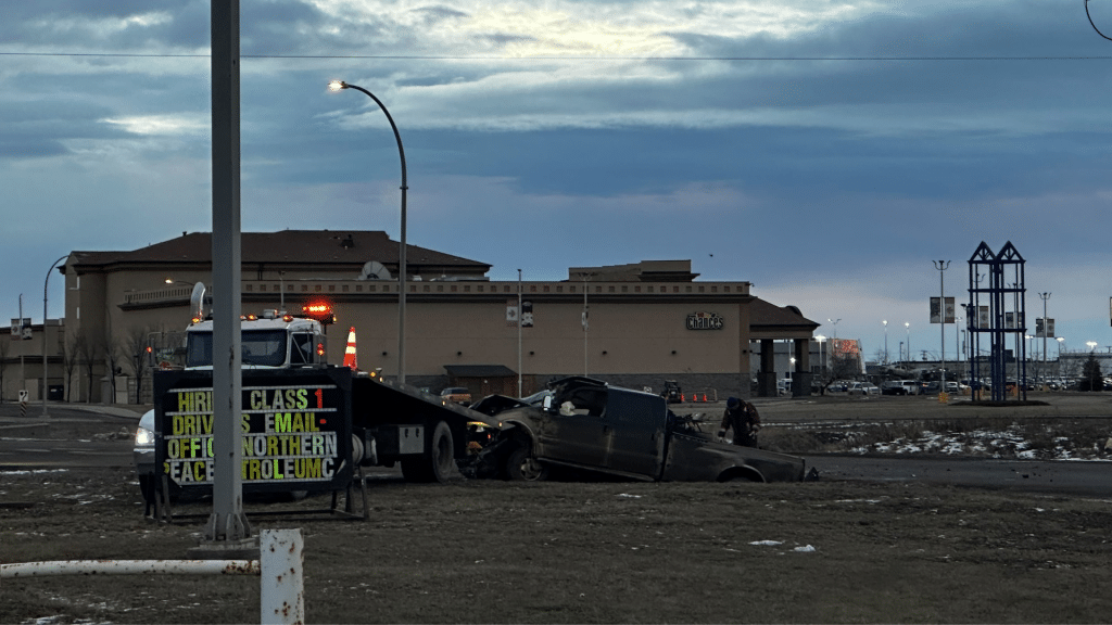 The stolen truck fled the scene, and according to the RCMP, was found upside down in a ditch near the intersection of Alaska Road North and West Bypass Road.