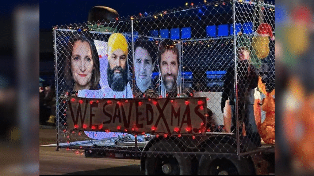 The float in question depicts four federal politicians, including Prime Minister Justin Trudeau and NDP leader Jagmeet Singh, in a cage with a sign that reads “We saved Xmas.”