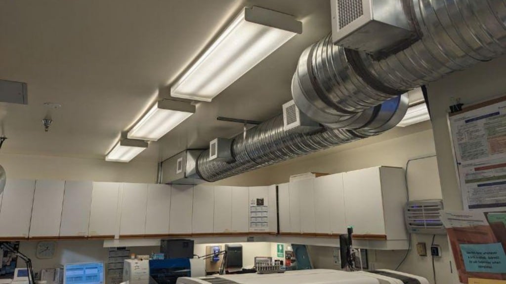 Northern Health says the new air conditioning system allows the laboratory to modernize and expand its capabilities without compromising the safety of either staff or lab samples. Newly installed ducting triples the amount of air moving into the department, and the new chiller unit outside the lab boosts air conditioning capacity.