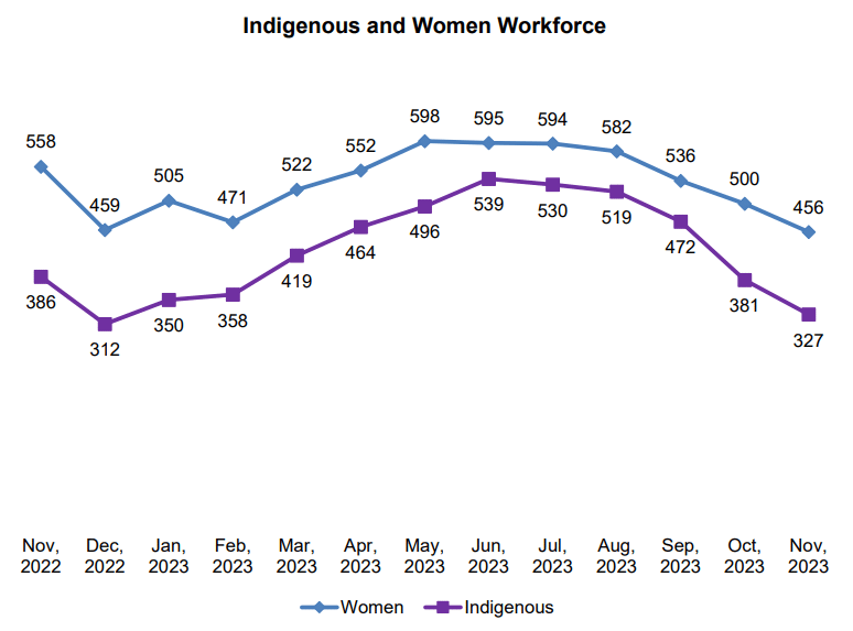 The report also provides the number of Indigenous people who worked on Site C, adding that workers voluntarily self-declared their Indigenous status to the employer. There were 327 Indigenous workers in November.