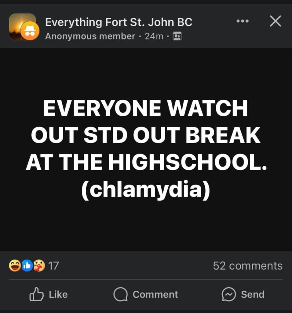 The clarification comes in after an anonymous user posted claiming there was a chlamydia outbreak at the high school in a local Facebook group Sunday evening. The post has since been removed.