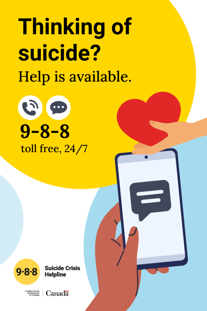 988 is a 24/7 crisis line for suicide prevention available by call or text in Canada.