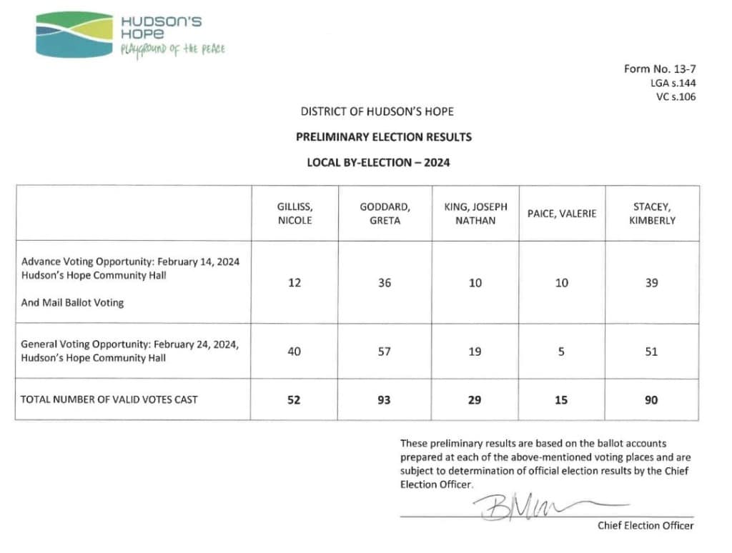 HUDSONS HOPE, B.C. — Greta Goddard has been elected as the District of Hudson’s Hope’s newest councillor following Saturday’s by-election.