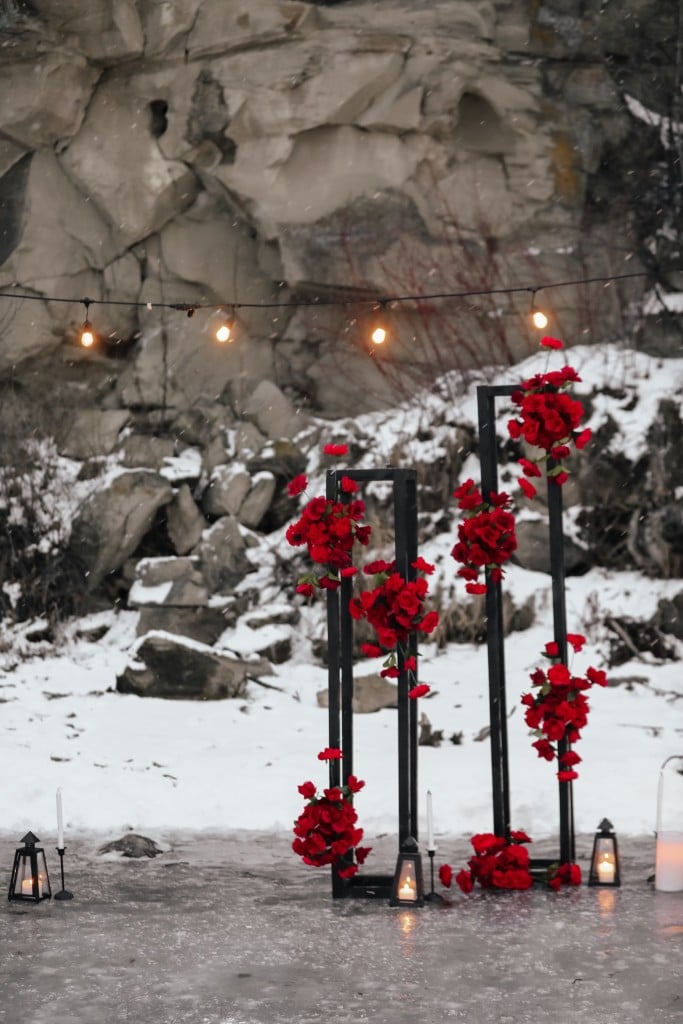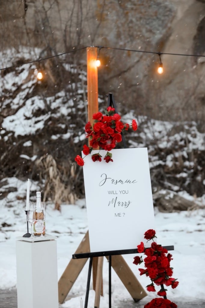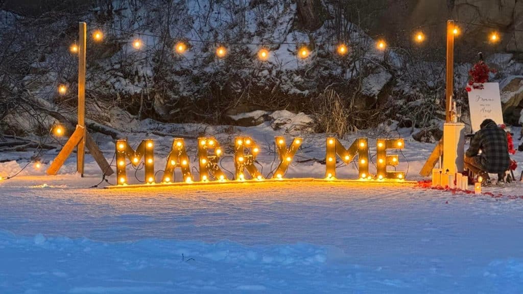 Below some cliffs off of Charlie Lake, fairy lights, candles and flowers were set up on the ice, with the words “MARRY ME” in lights and a sign that read “Jasmine, will you marry me?”