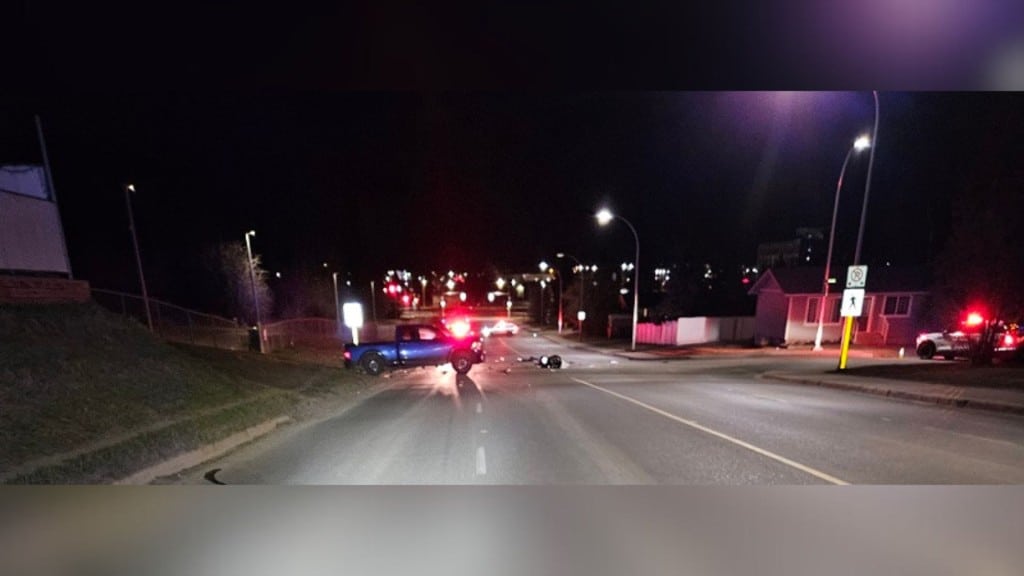 According to the Fort St. John RCMP, the detachment received a call at 9:38 p.m. about a crash involving a pickup truck and a motorcycle, with significant injuries to one of the drivers, near 93rd Street and 96th Avenue.Â