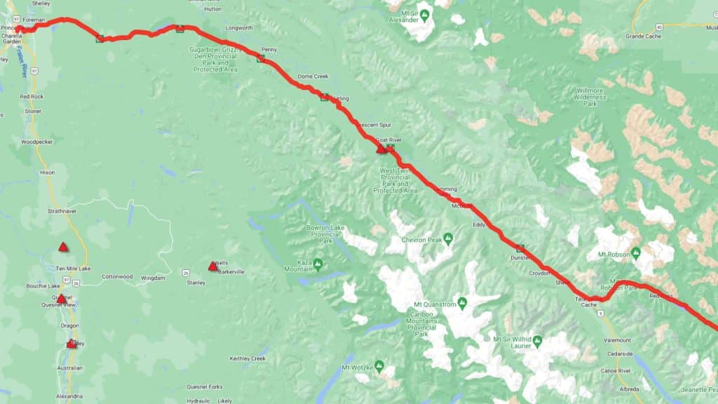 For travel to Grande Prairie, drivers are instructed to take Highway 16 west to Prince George, proceed north to Dawson Creek via Highway 97, and then east to Grande Prairie.
