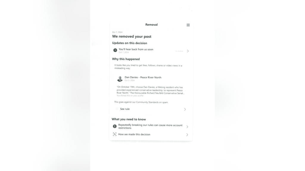 If I had to guess on why FB removed this post, I would say someone (or more) who do not wish to see Davies elected as our member of the Legislature (MLA) made false statements to FB that the word “Conservative” belongs to the Conservative Party of BC and the use of it by Davies in his materials misleads them, that when they click on the link to Davies’ website they think they are going to the Conservative Party of BC website. Davies website and published materials are clear on who he is and nowhere on the website or otherwise does it reference as being part of the “Conservative Party of BC”.