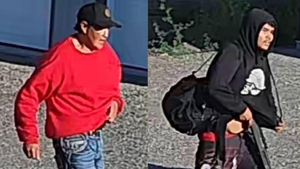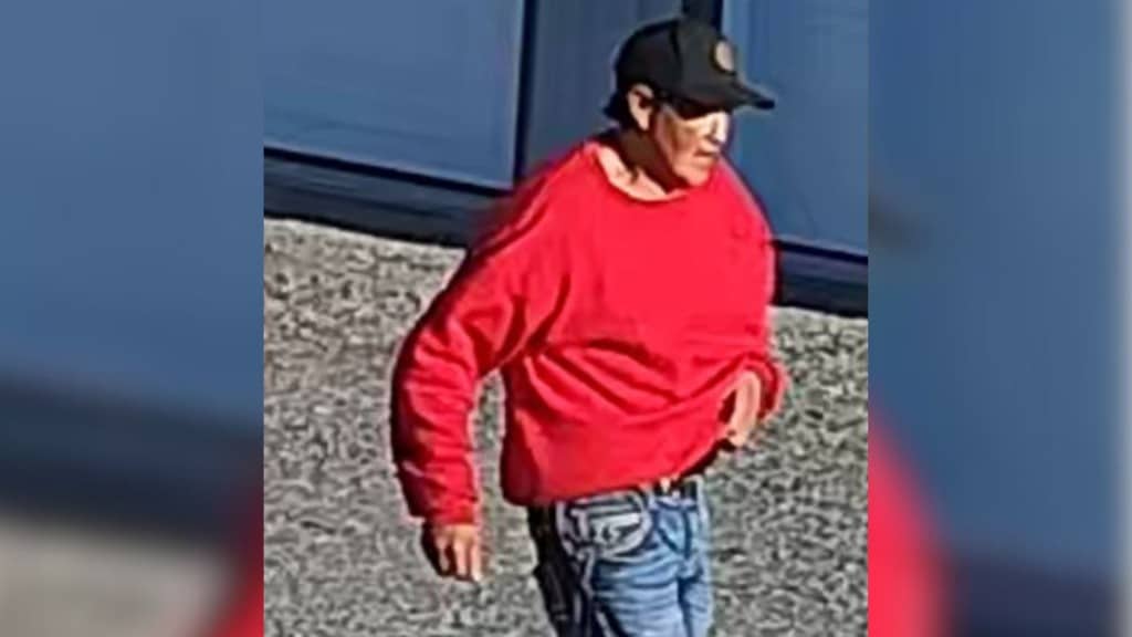 The first suspect is described as a tall man wearing a long-sleeved red sweatshirt, black ball cap, and blue jeans.