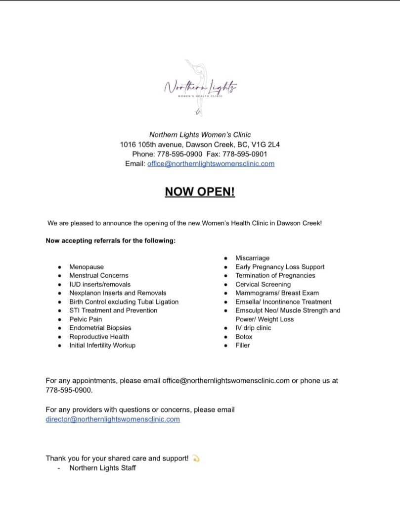 The Northern Lights Women’s Health Clinic is now open in Dawson Creek, with services for menopause, pregnancy, reproductive health and more.