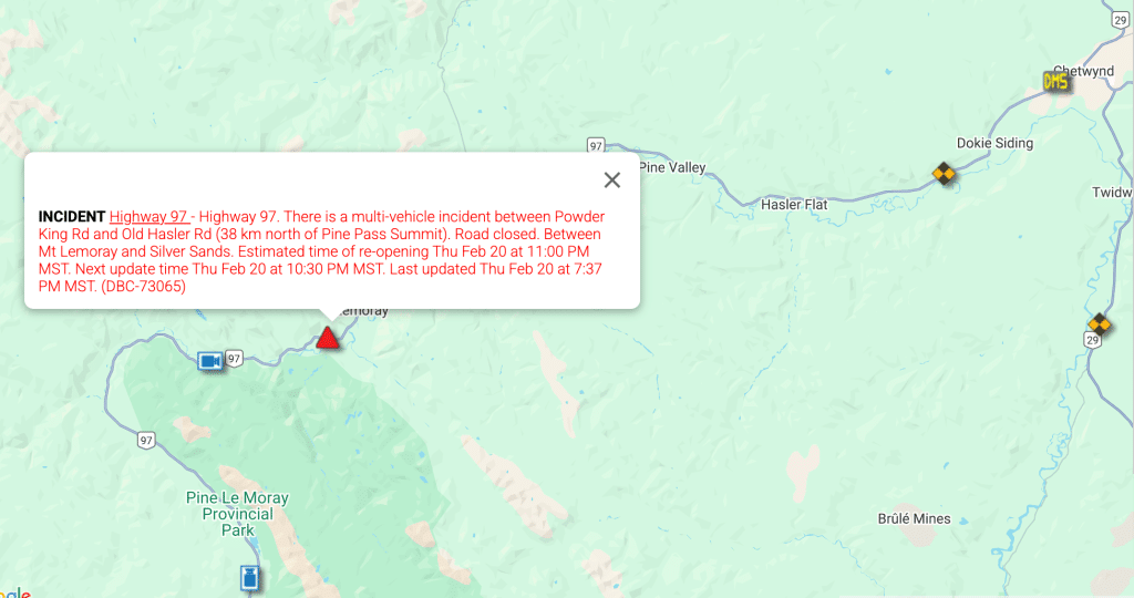CHETWYND, B.C. — A multi-vehicle incident has shut down a section of Highway 97 through the Pine Pass, with no traffic able to pass in either direction.