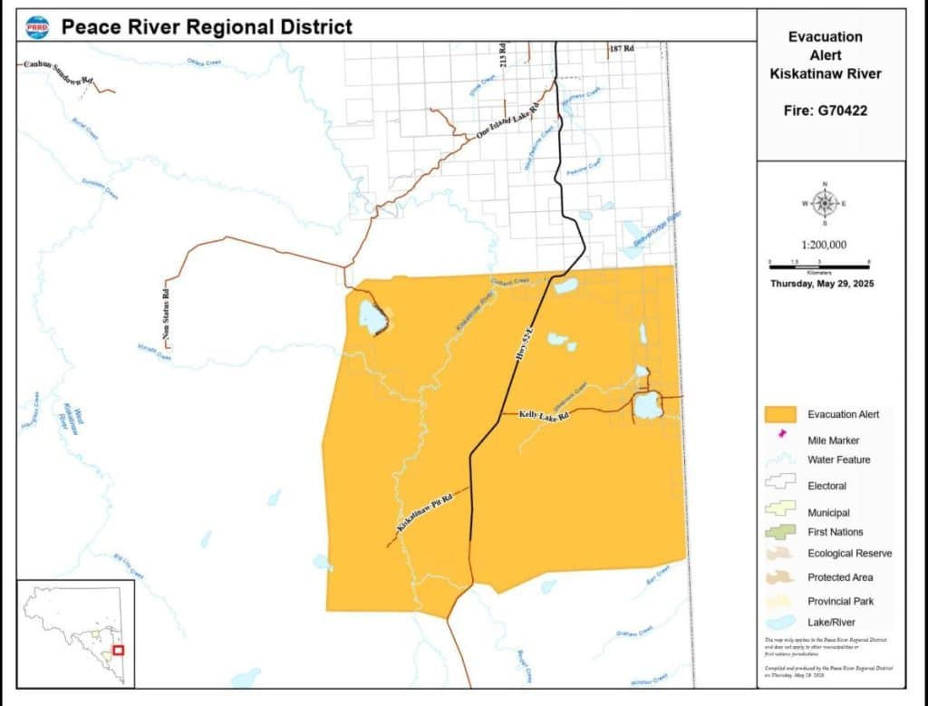 The Peace River Regional District (PRRD) has issued an evacuation alert as of 1:30 p.m. on recommendation of the BC Wildfire Service (BCWS).