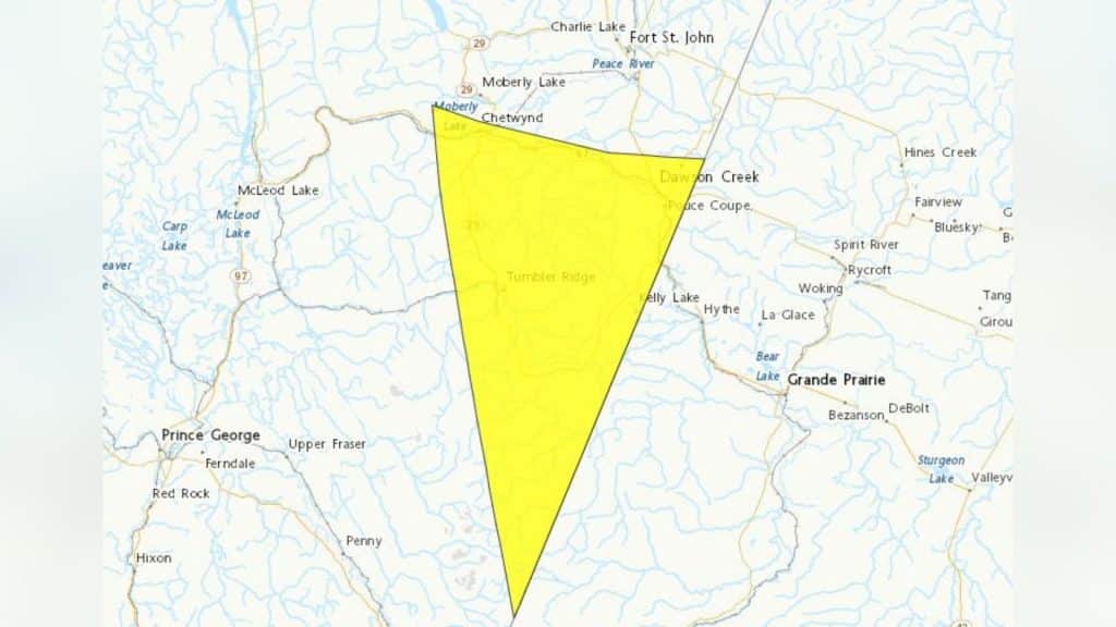 There were also warnings issued on June 16th for a portion of northeast B.C. from the border with Alberta, west to Pink Mountain and north past the border with the Northwest Territories, and a triangle of the region from Dawson Creek and Chetwynd down the border with Alberta to a point on the border near Prince George.