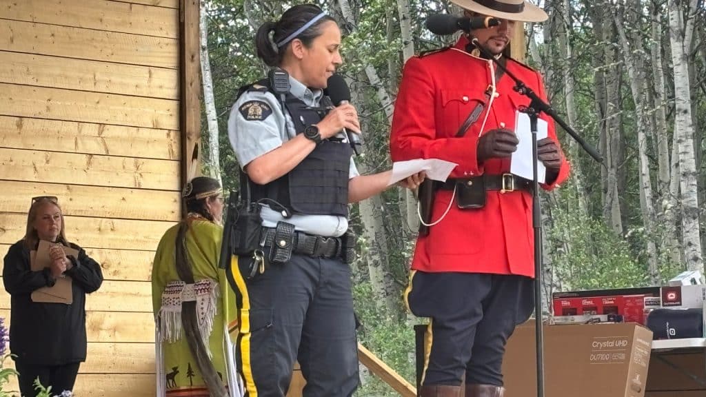 It was a special moment for Chetwynd detachment RCMP officers Sgt Wahnese Antonioni-Stevens and Indigenous policing services counsel Brayden Waughtal, each of whom are Indigenous.