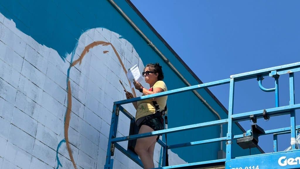 Although the original schedule for the mural was to take two weeks, there were obstacles including wet weather and a death in Parenteau’s family.