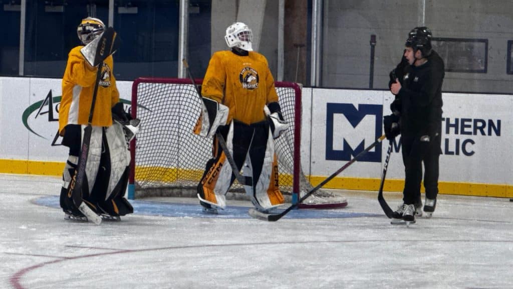 Huskies goaltenders take a break during practice on Thursday, October 2nd at the North Peace Arena. (Ed Hitchins, Energeticccity.ca)