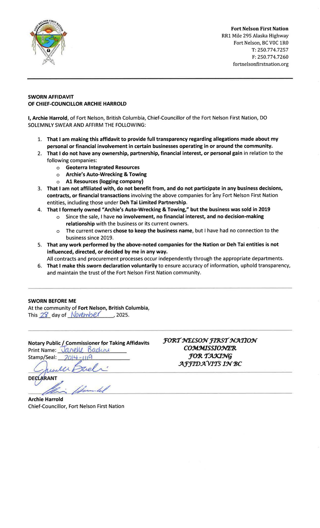 Fort Nelson First Nation (FNFN) Chief councillor Archie Harrold submitted a written affidavit on the nation’s Facebook page, denying allegations he is in conflict of interest in owning several local establishments.