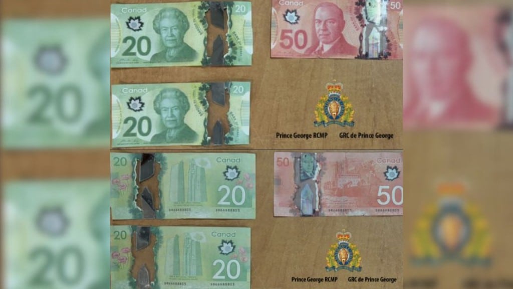 Examples of counterfeit money previously taken by the Prince George RCMP. (Prince George RCMP)