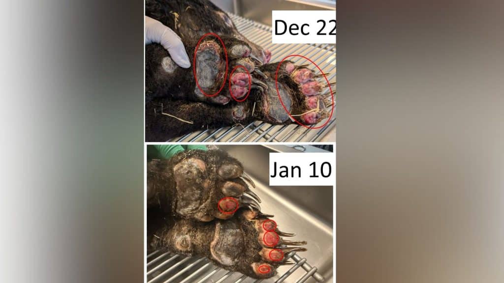 In its latest update to Facebook on January 10th, it is noted the bear’s burn marks on its paws are “much smaller,” but Langen says Valkyrie will continue to have bandages on her paws for the foreseeable future.